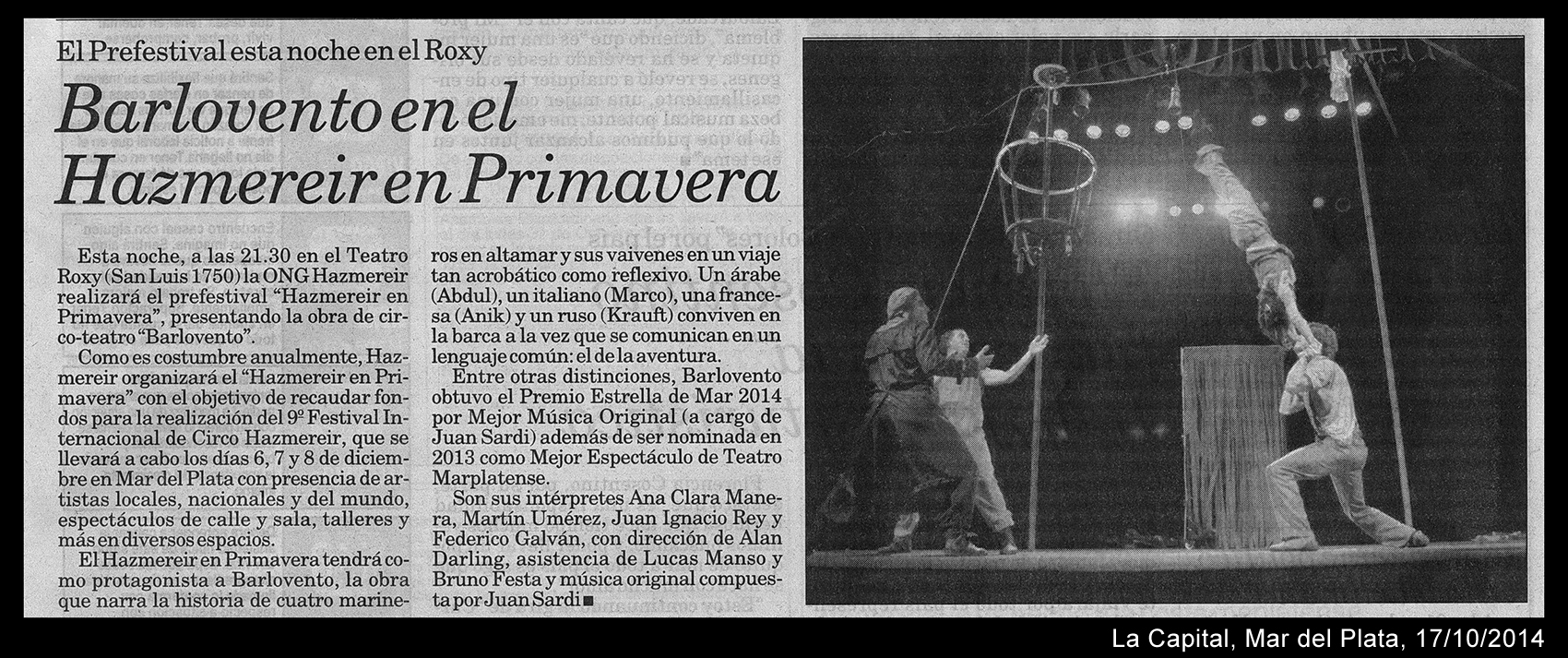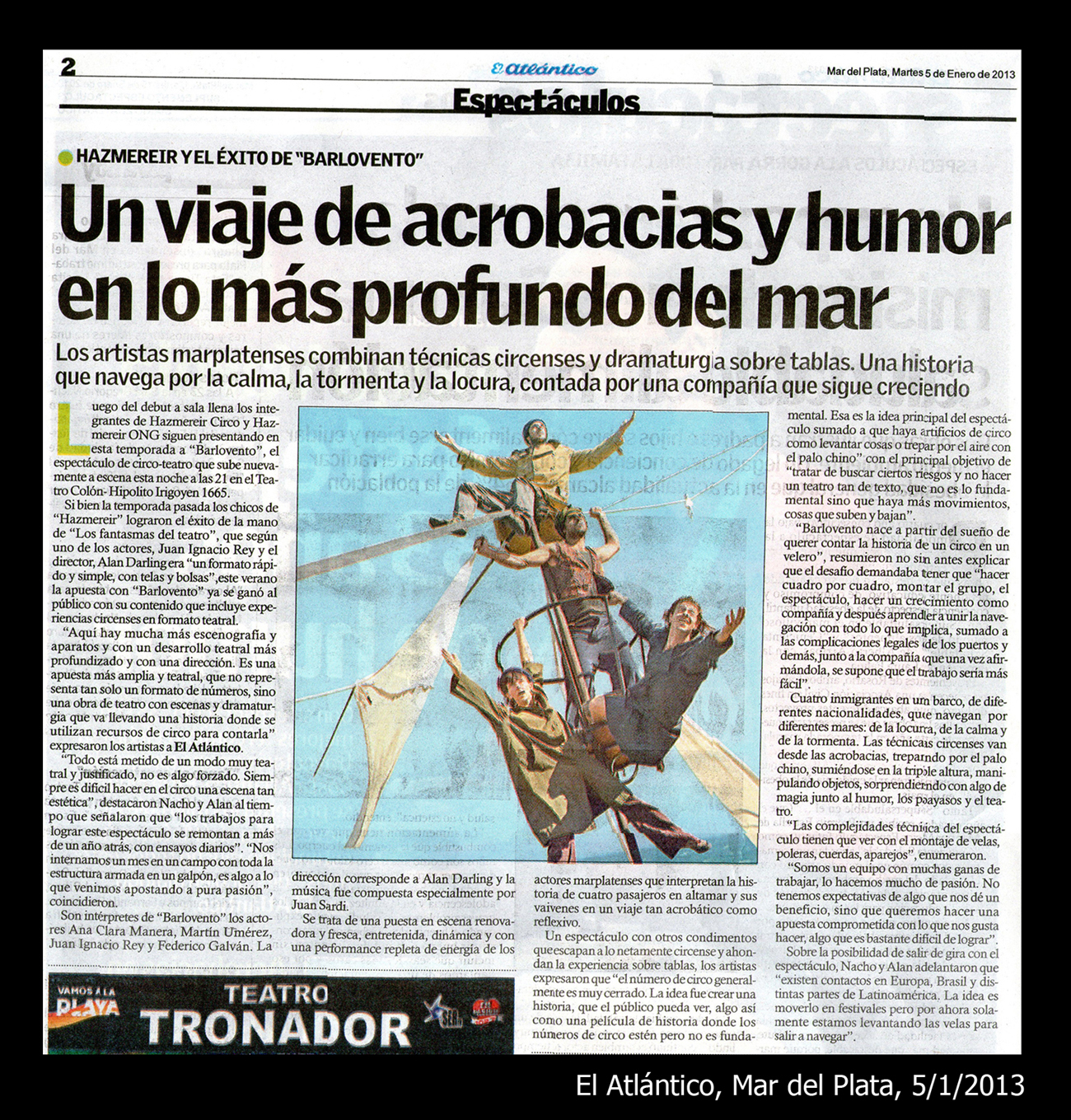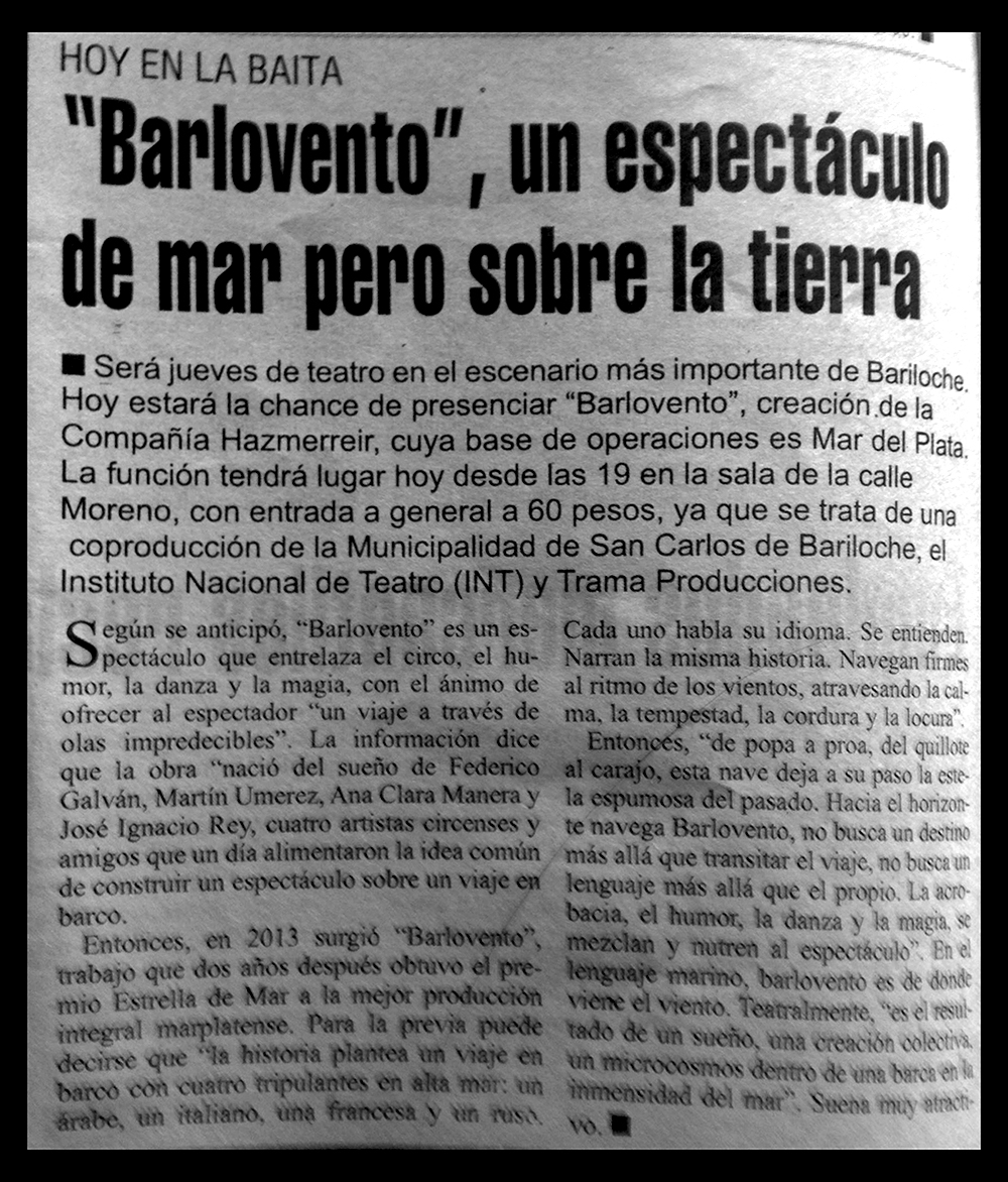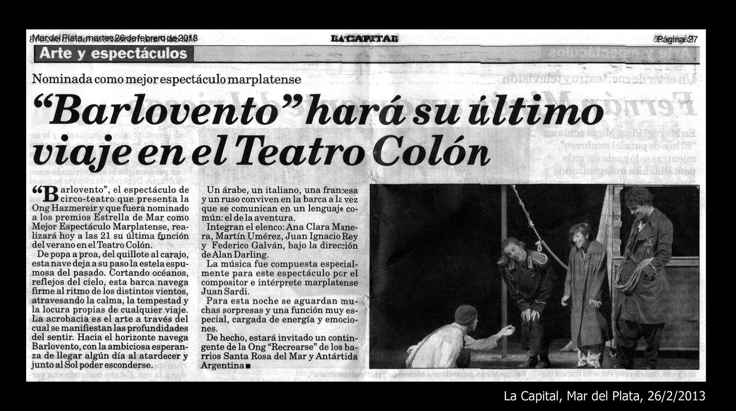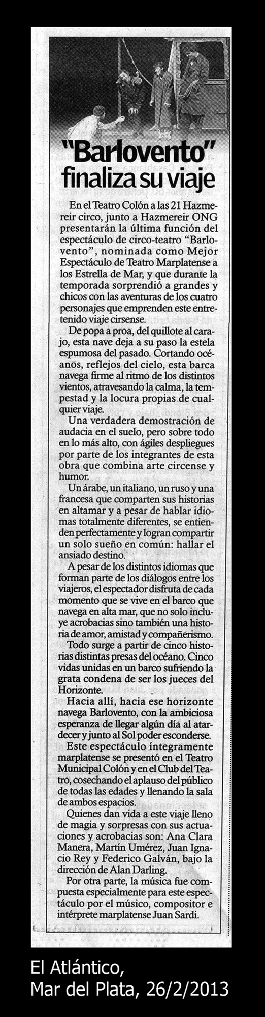 “… barlovento un espectáculo maravilloso, marplatense, un espectáculo de circo teatro. Ténganme fe, este es un espectáculo imperdible, en el cual la ternura, la creatividad, la emoción, la habilidad se dan la mano …”