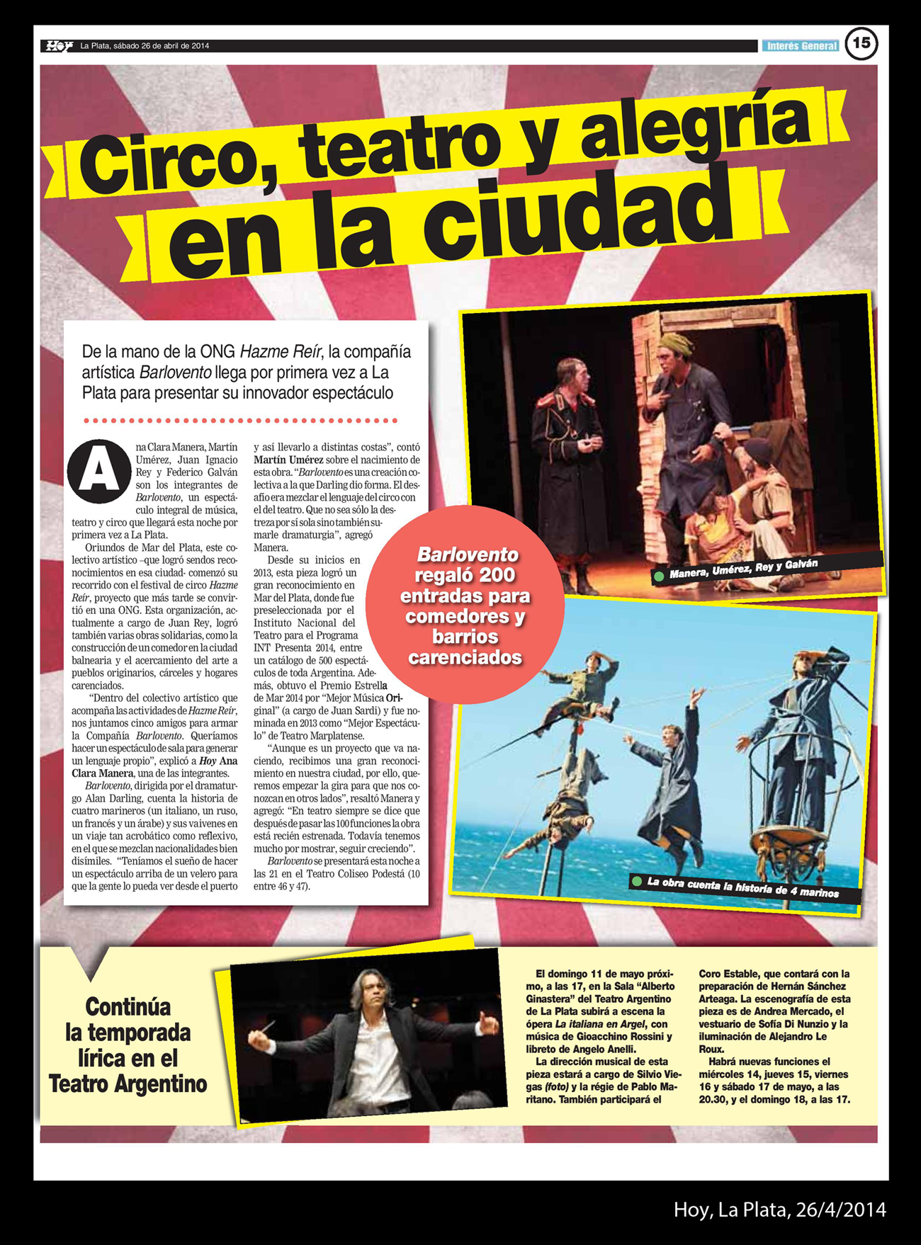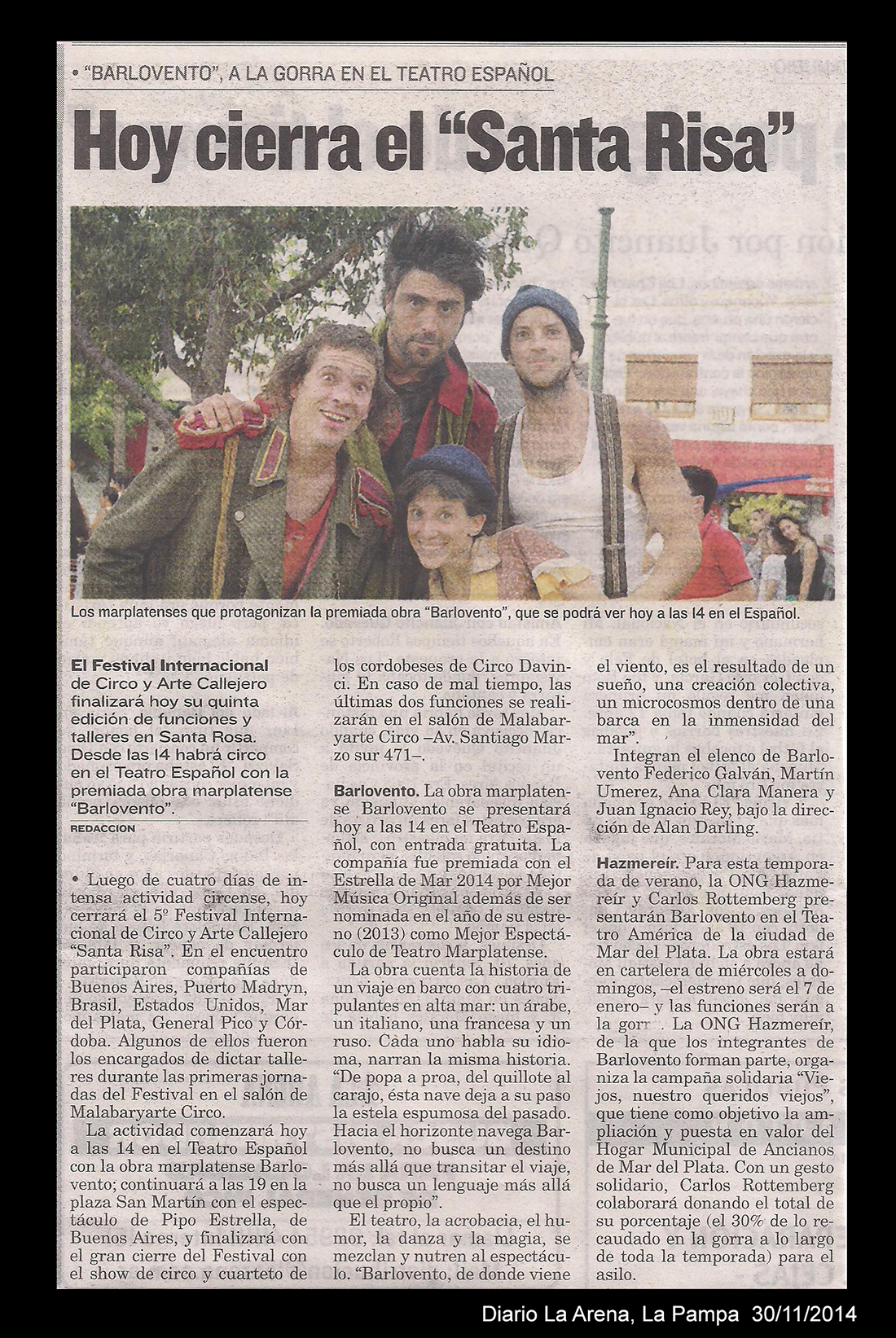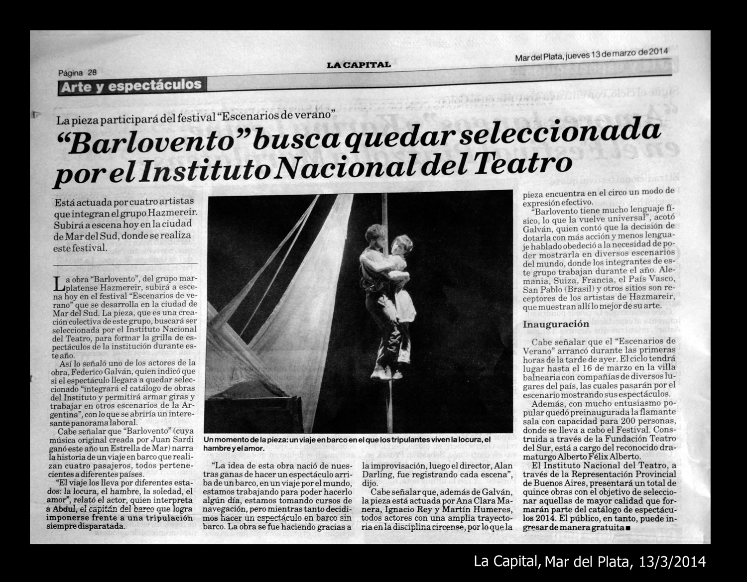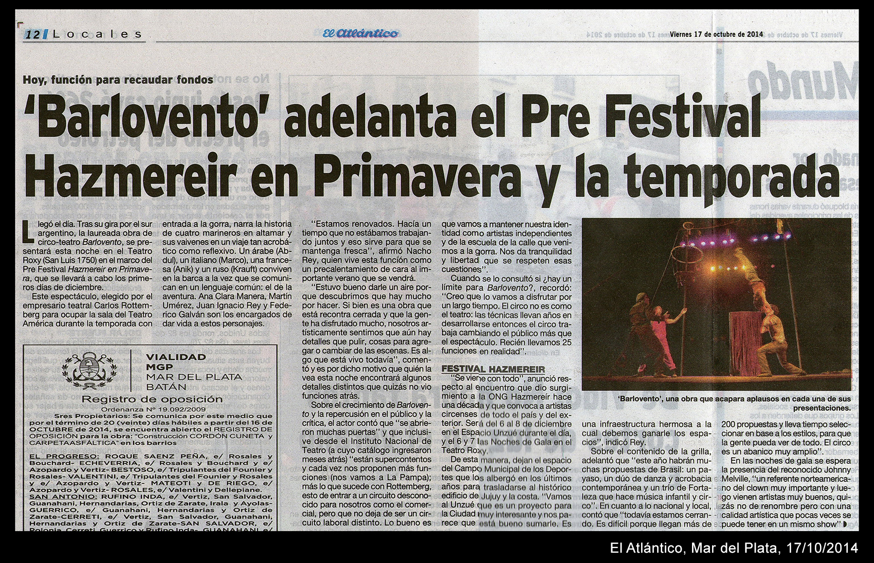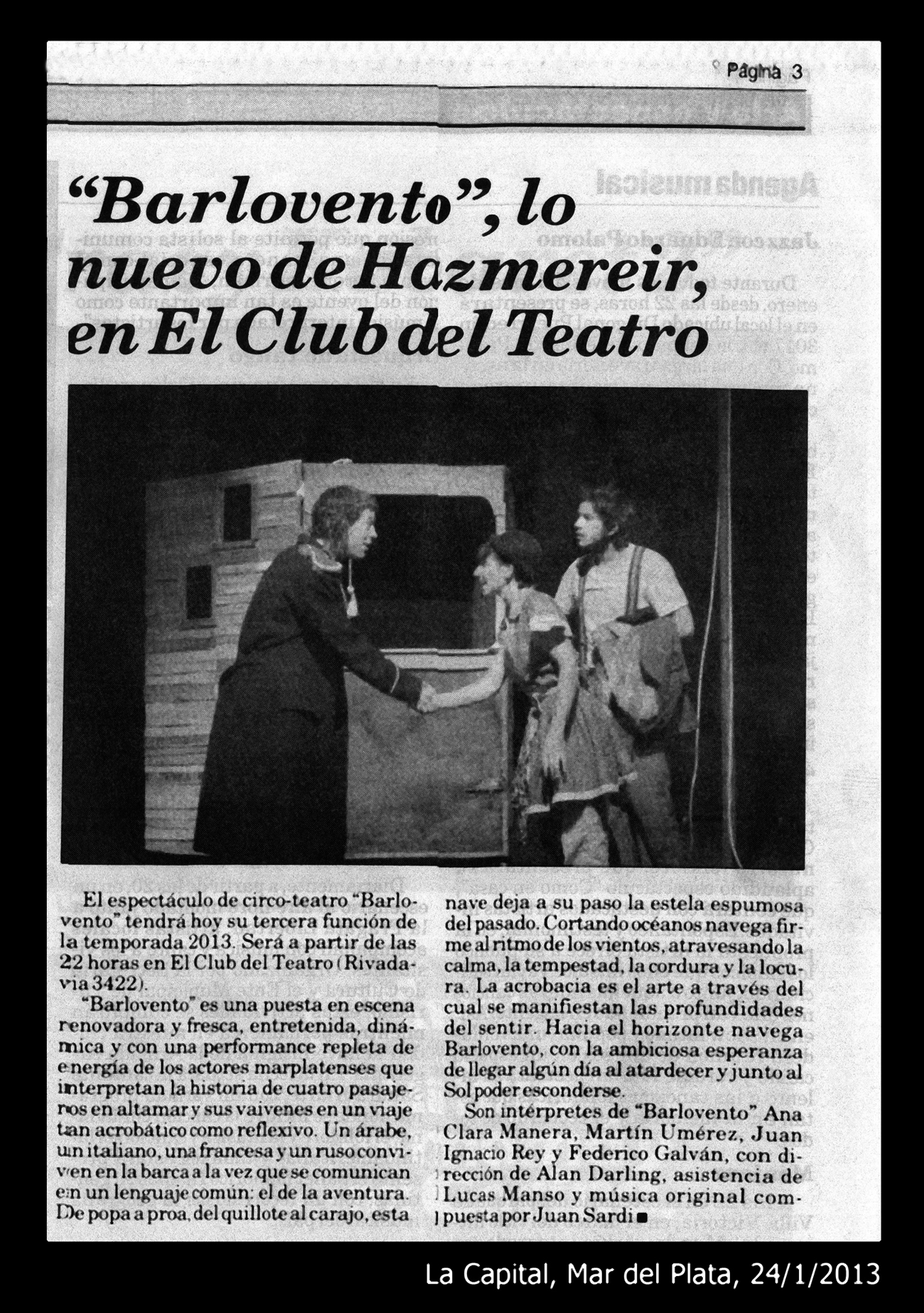 “… barlovento un espectáculo maravilloso, marplatense, un espectáculo de circo teatro. Ténganme fe, este es un espectáculo imperdible, en el cual la ternura, la creatividad, la emoción, la habilidad se dan la mano …”