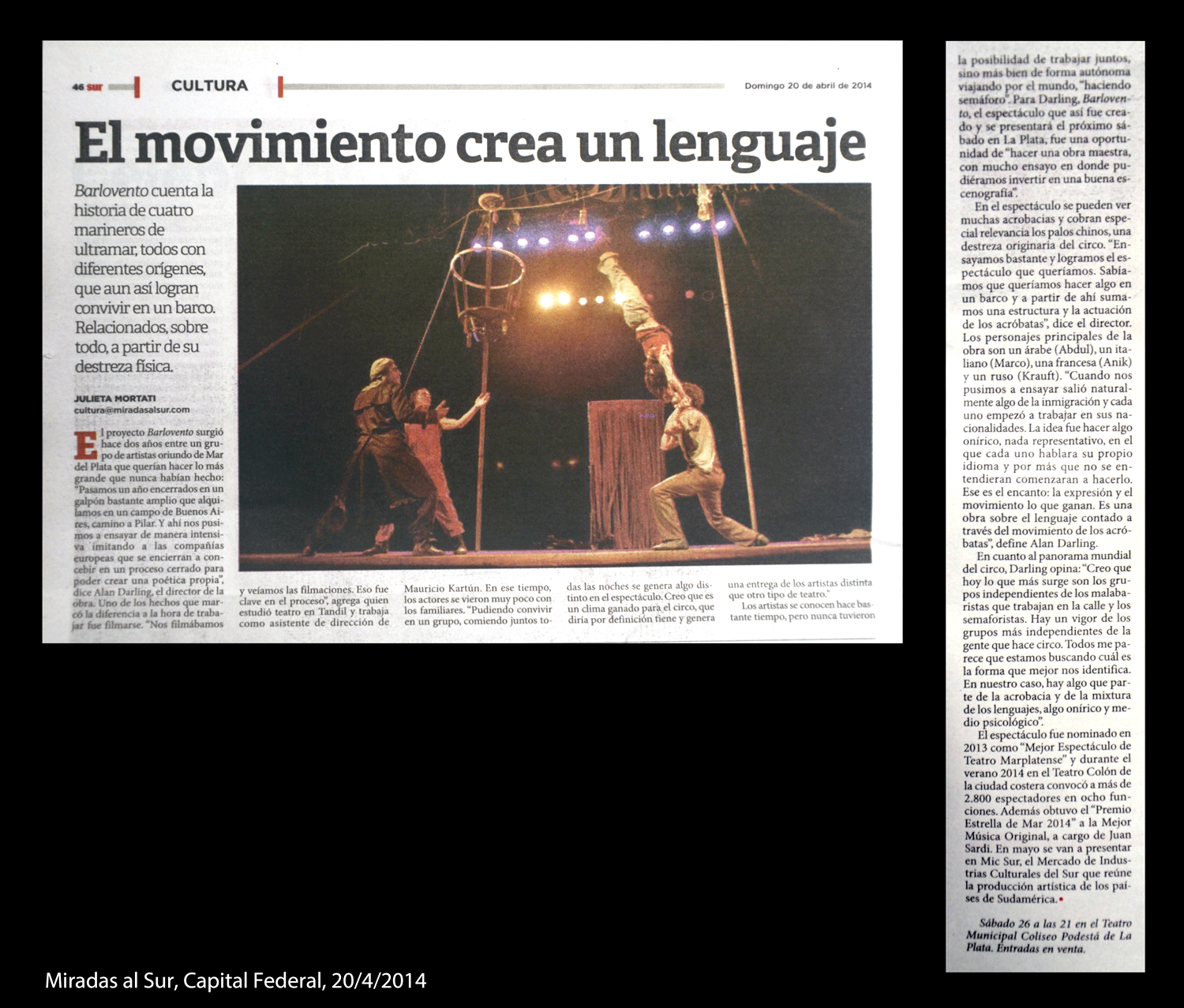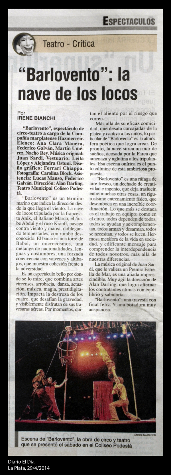 “… un espectáculo que fue posiblemente lo mas interesante de este experiencia en Mar del Plata, que es barlovento...” ”… Me pareció un convenio de toda la magia, inspiración, gracia, búsqueda que un espectáculo teatral tiene que tener, teatral y circense en este caso, pero yo lo que rescato lo que me llevo más es lo que de teatral tiene el espectáculo, me resulto absolutamente fascinante …”